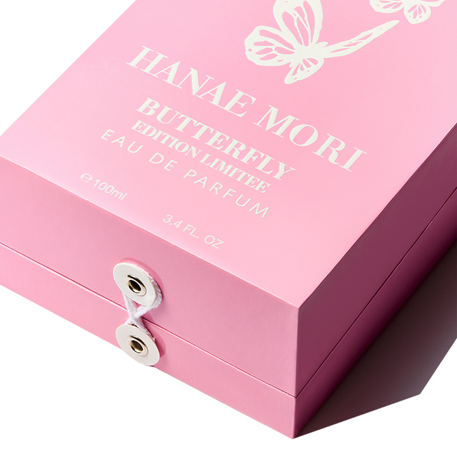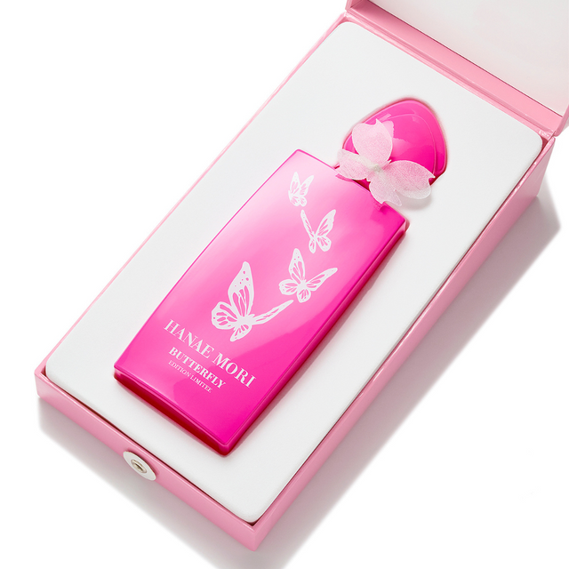 The intense rose lacquered collector's bottle is adorned with a flight of white butterflies. A white chiffon butterfly graces the cap of the lacquered glass bottle. This whimsical jewel can be wrapped around your finger or hair, serving as a link of attachment to your fragrance. Presented in its candy pink case, this marvel unveils itself by delicately untying the white cord.